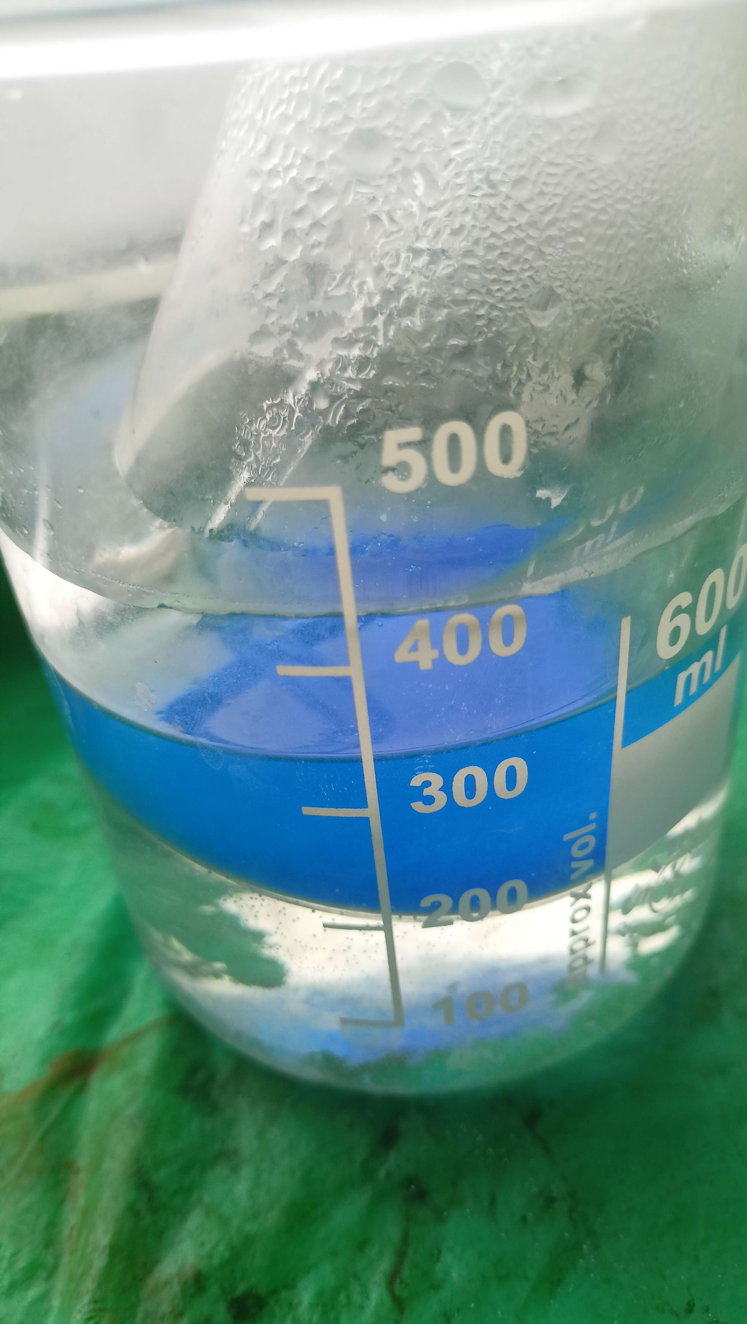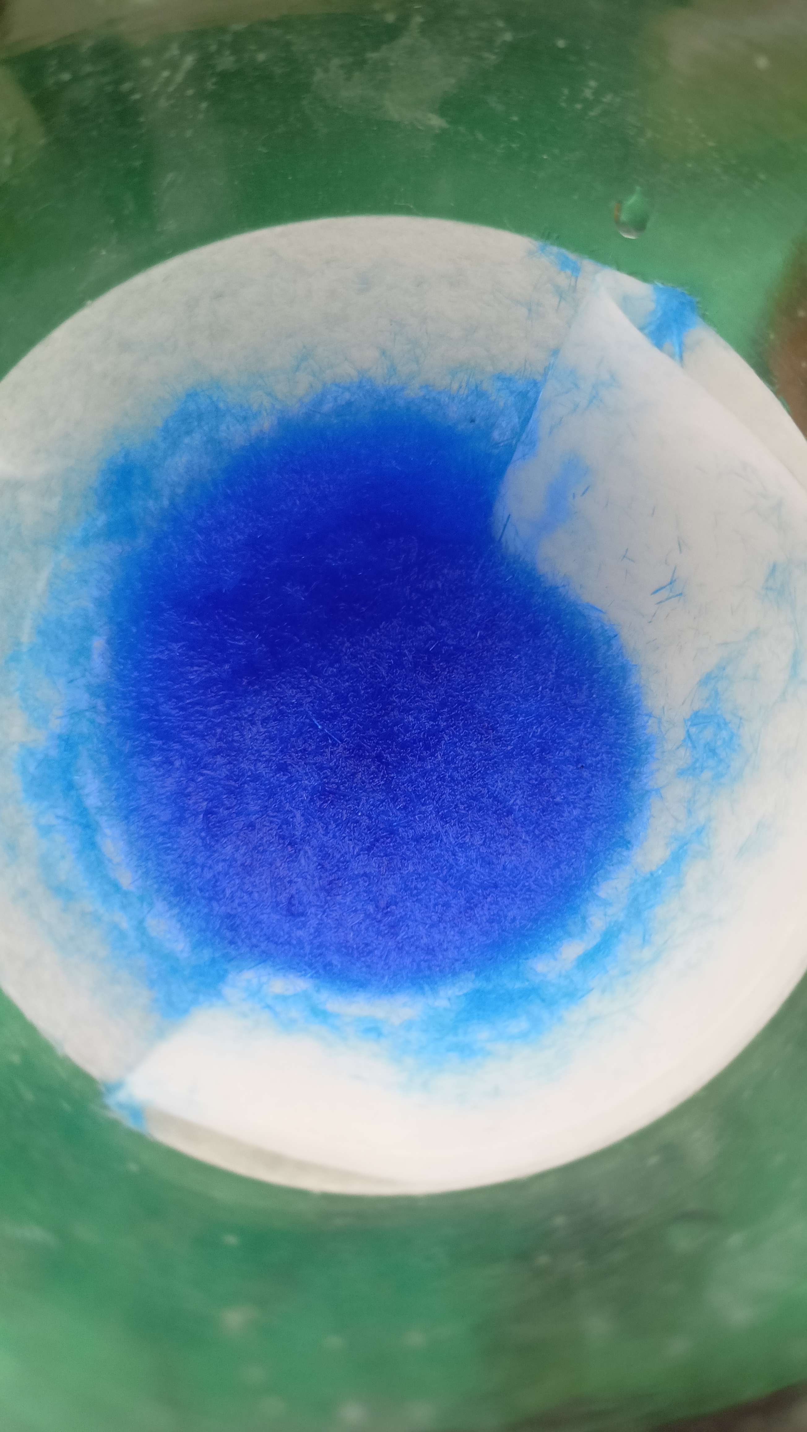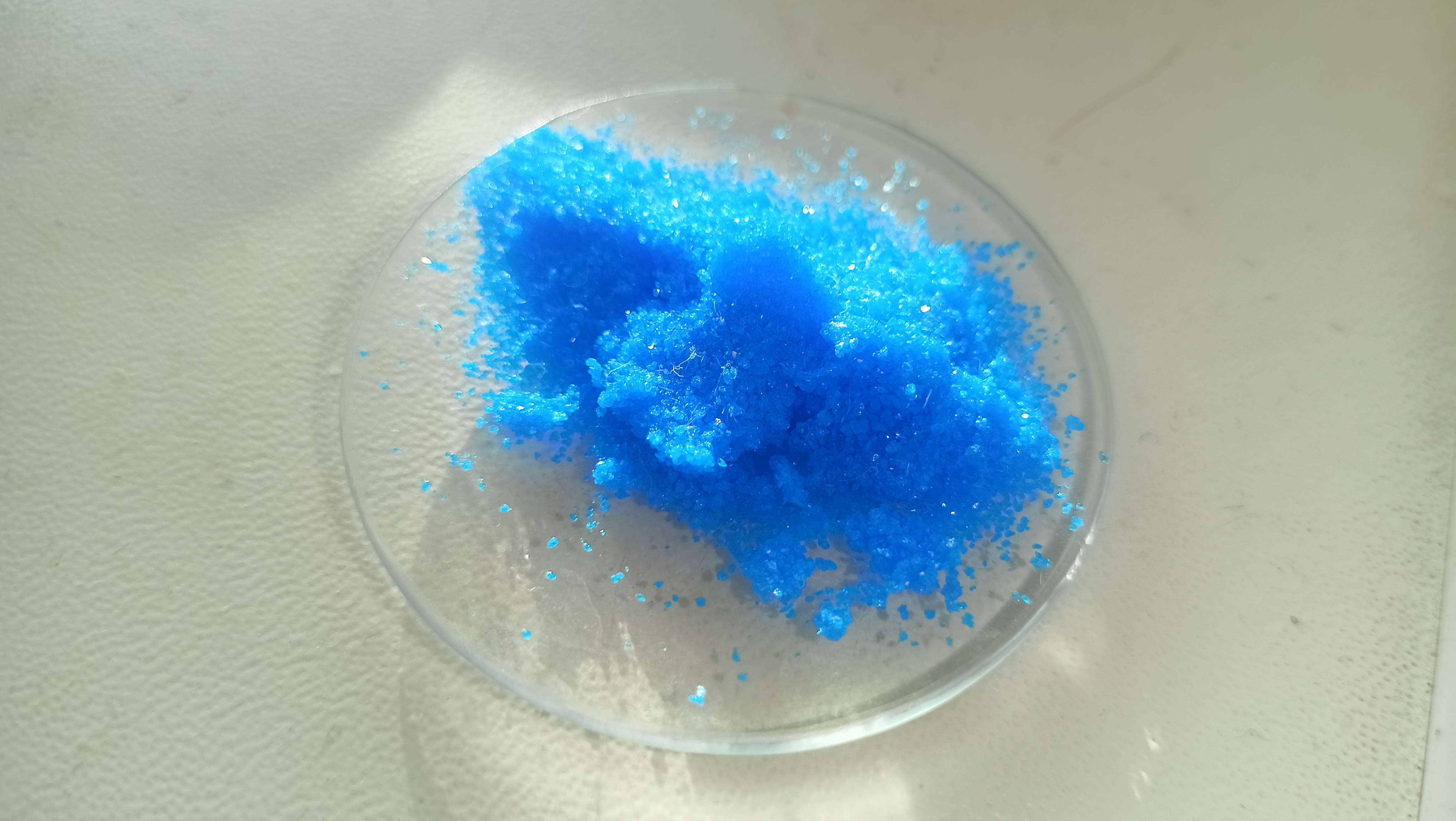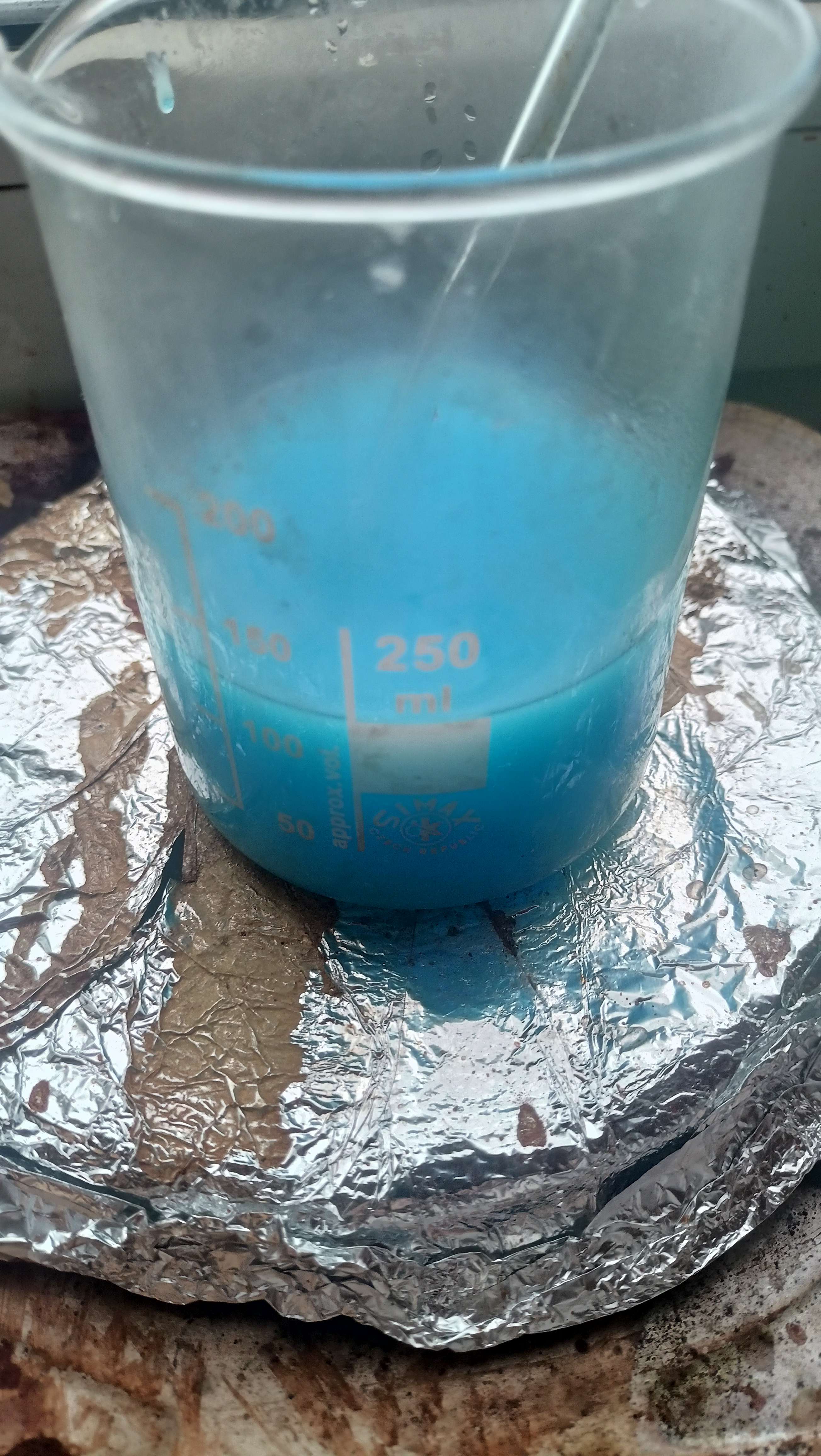 At first I have attempted to replicate a synthesis found on sciencemadness.org, as it seemed simple enough. 2.49 grams of copper (II) sulfate were added to 60 degree C water and stirred until dissolved. After, 3.68 grams of potassium oxalate monohydrate were added to the solution, and a murky cloud of copper (II) oxalate were formed. At that point, I was screwed. Some of the complex has formed, indicated by a darker colour solution, but a mass of insoluble copper oxalate settled on the bottom. It didn’t seem eager to redissolve.