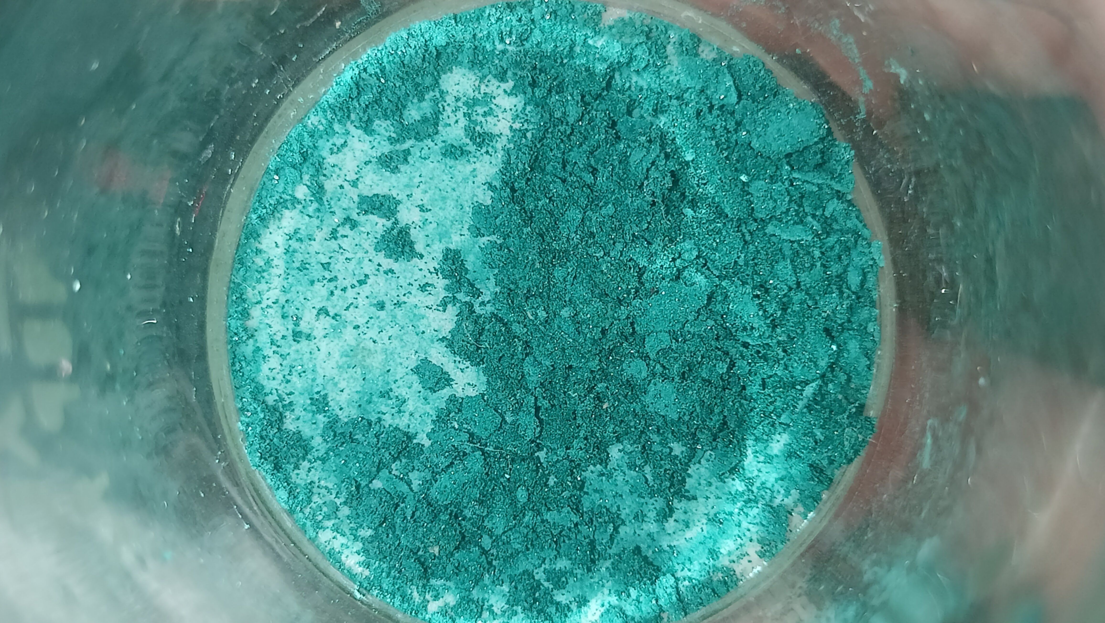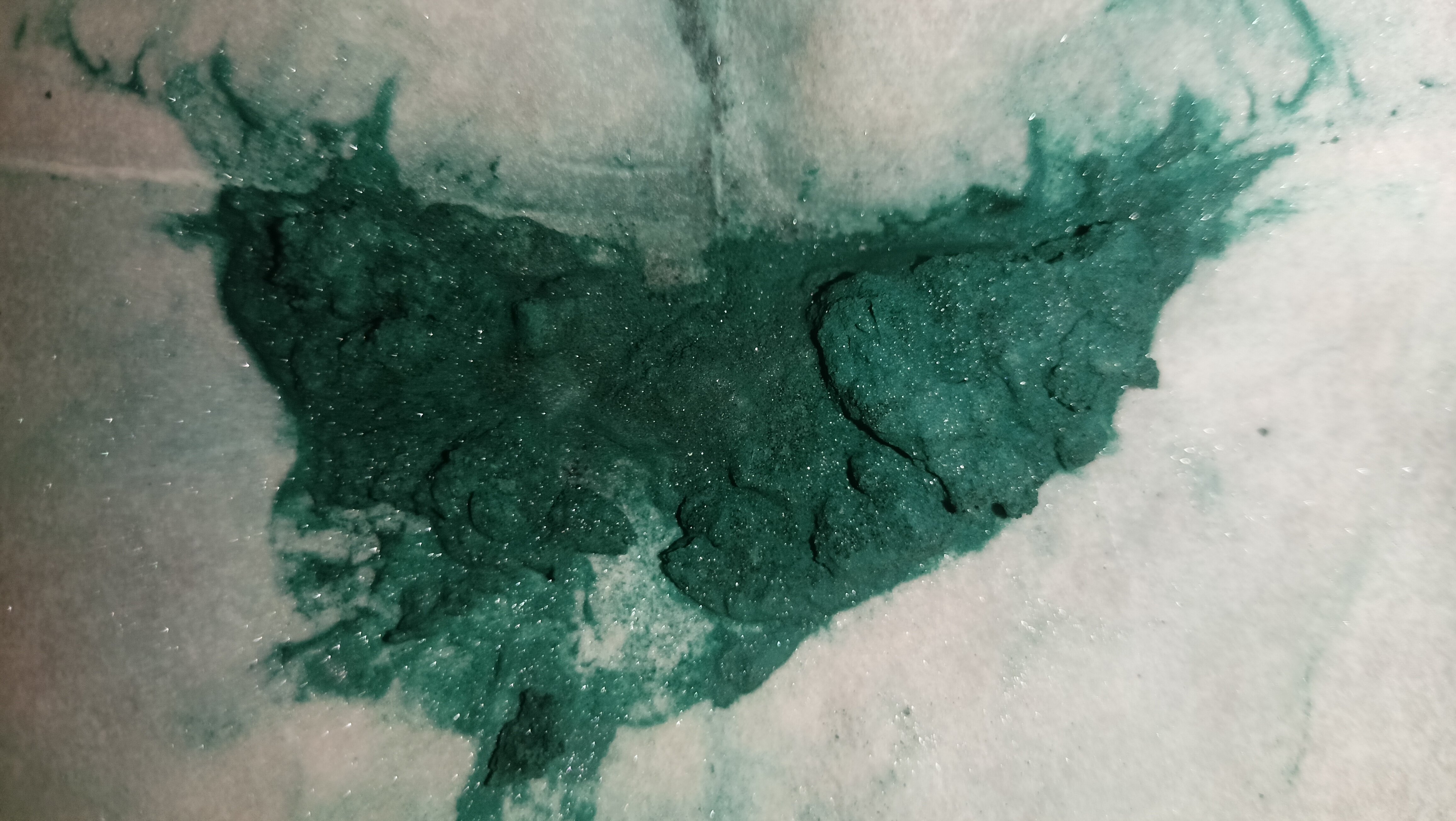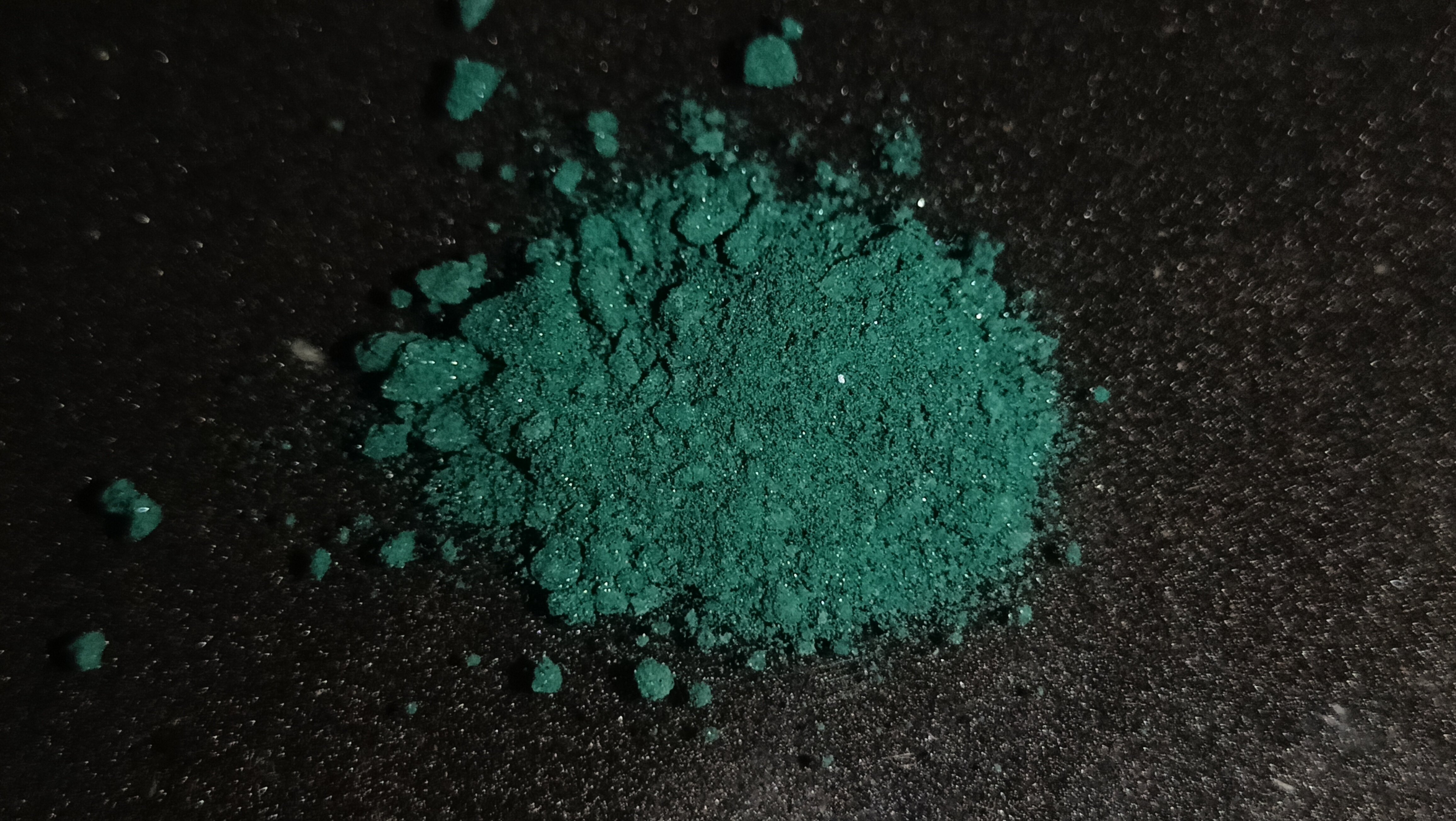 Taking a picture that actually displayed the sparkliness of the target compound was an exercise in utter misery, as the black cloth background we got off aliexpress.com isn’t well suited for photography in approaching-macro territory, and was promptly replaced with a sheet of sandpaper that spent the last 2 years inexplicably lying in a corner of our bedroom. (donations for camera equipment and such are very welcome)