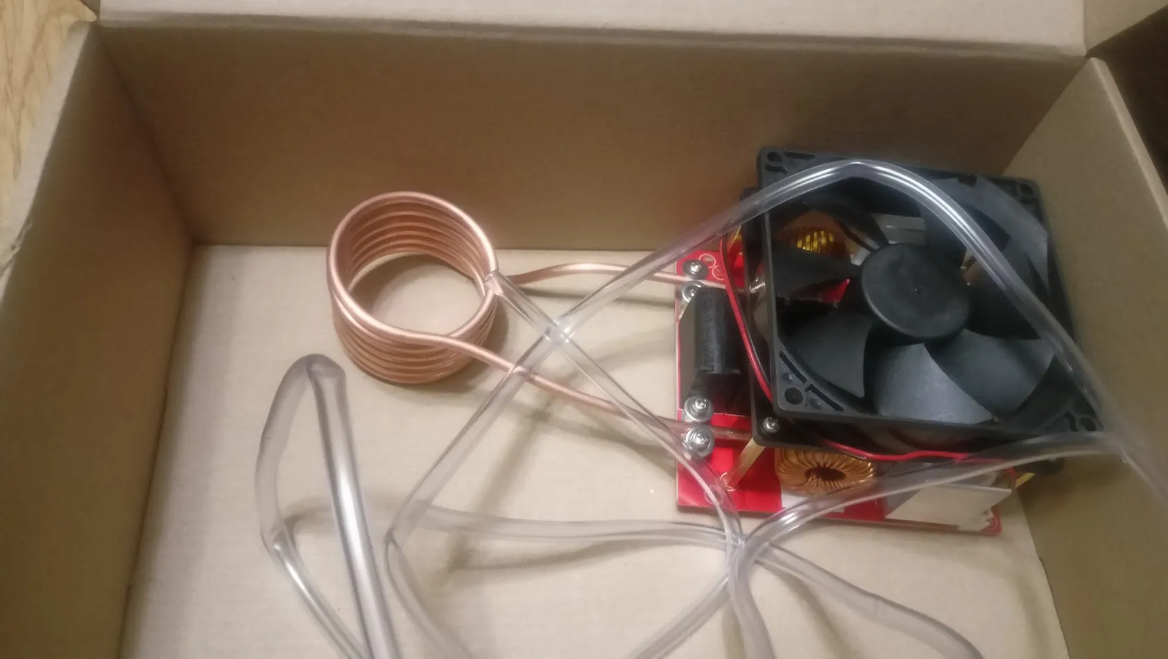 In the really scuffed cardboard box (not the one pictured) there really wasn’t much included except the board itself, a cooling fan, some silicone tubing for watercooling, a copper work coil and some standoffs and washers for attaching the cooling fan and for the connection of the work coil to the actual board (more on that later).