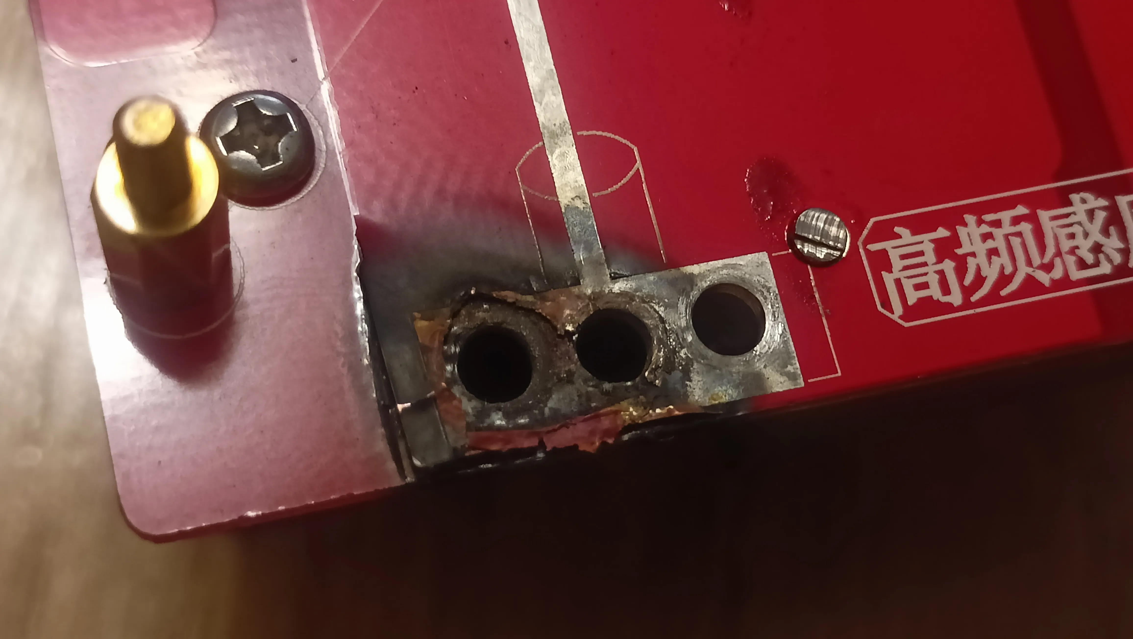 The test also revealed another problem, namely the utterly horrible “connection system” the board uses. Instead of a screw fitting or a hose clamp style connection, it is “implemented” with 3 standoffs and 4 washers. There is nothing redeemable about it. During one of the experiments, the work coil was jostled slightly, leading to the coil slipping, causing the formation of a hotspot in a thermal runaway scenario where surface oxidation from heating increased the resistance, leading to an even larger, self-fueling increase in heating. Now some of the copper is delaminated from the board and everything looks really gross and also like total shit. A decision was made to machine a better connector out of copper.