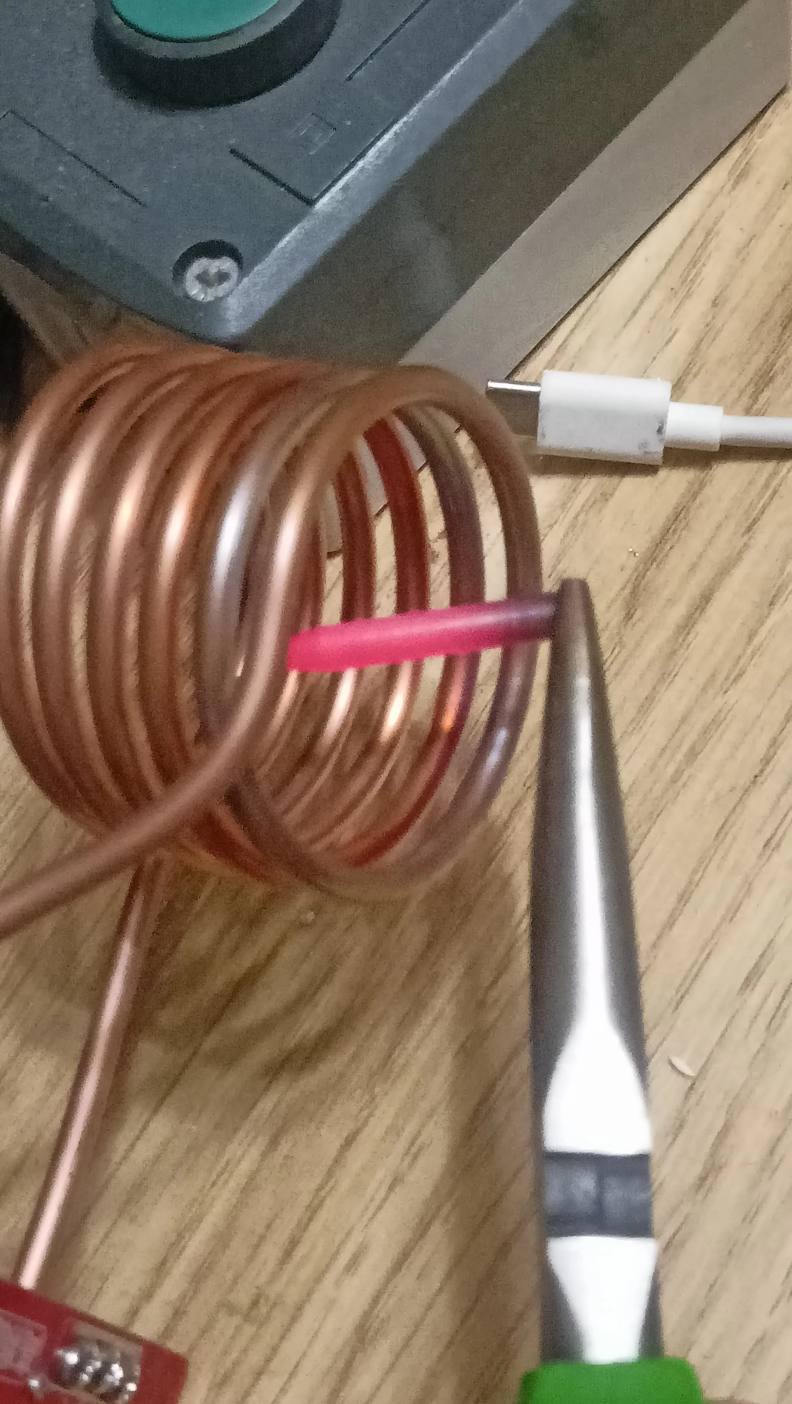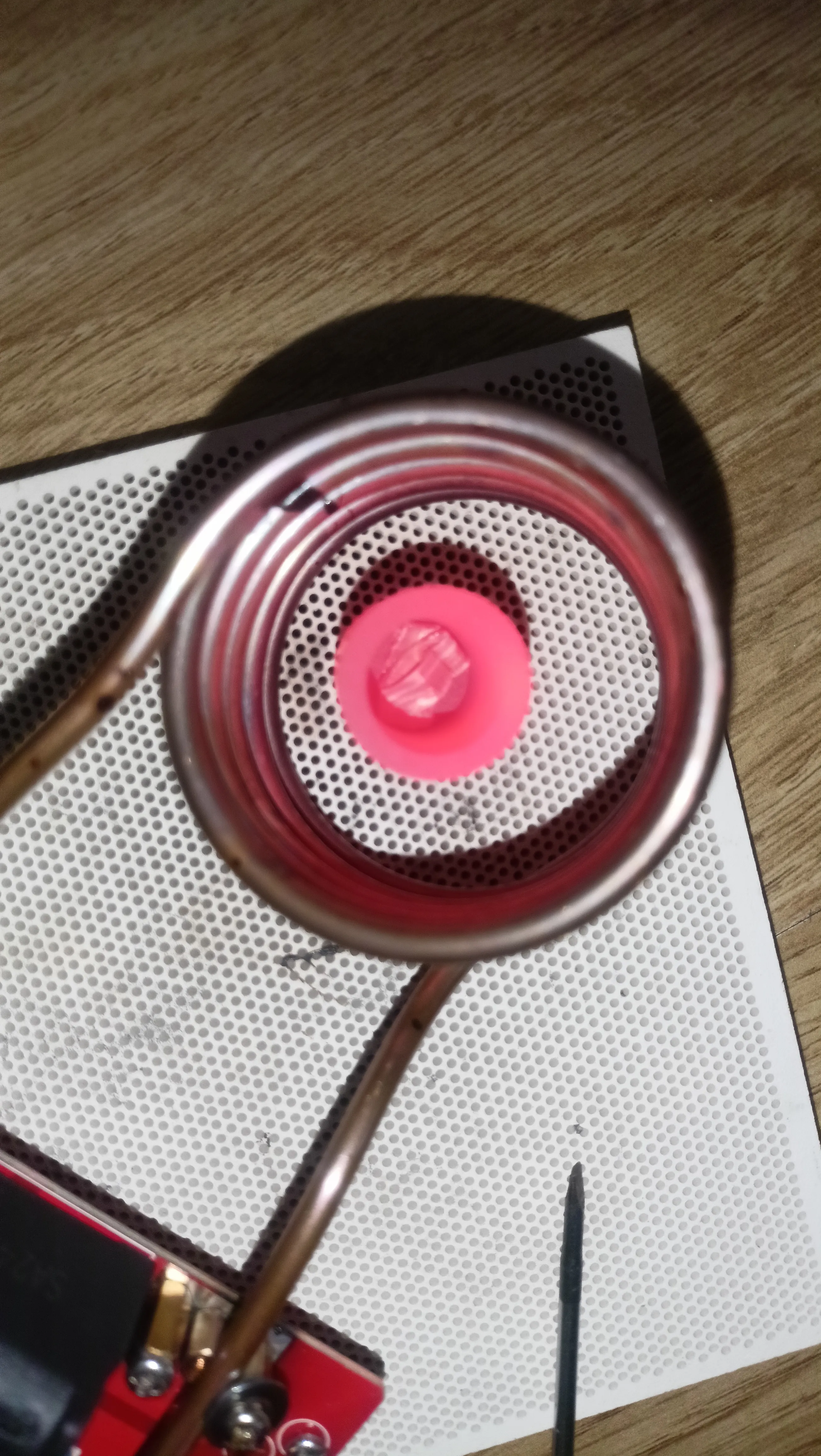 The attempts at using a conventional graphite crucible were also not without hangups, as the crucibles I got (40*40mm) were too big, and ended up being too strongly coupled4 to the work coil, causing the overcurrent protection to instantly trip, with nearly no heating happening in the process. In my final attempt to use this work coil, the standard-sized graphite vessel was replaced by a tiny one with the OD of 22mm, which thankfully easily got up to red hot within 30 seconds.