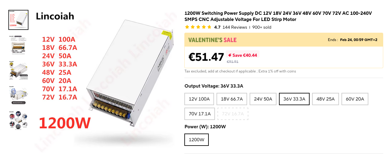 An optimal solution for this is either a high power (36V, 1kW+) general purpose switching power supply (can be had on aliexpress for relatively cheap), or a used/surplus server power supply. My initial idea for powering it was to simply use a 1.8kW variac and a really big bridge rectifier, but this turned out to be horribly unsafe and very impractical and expensive for what it was. I went with option A and shelled out the 40 or so euros for a 1.2 kW switcher.