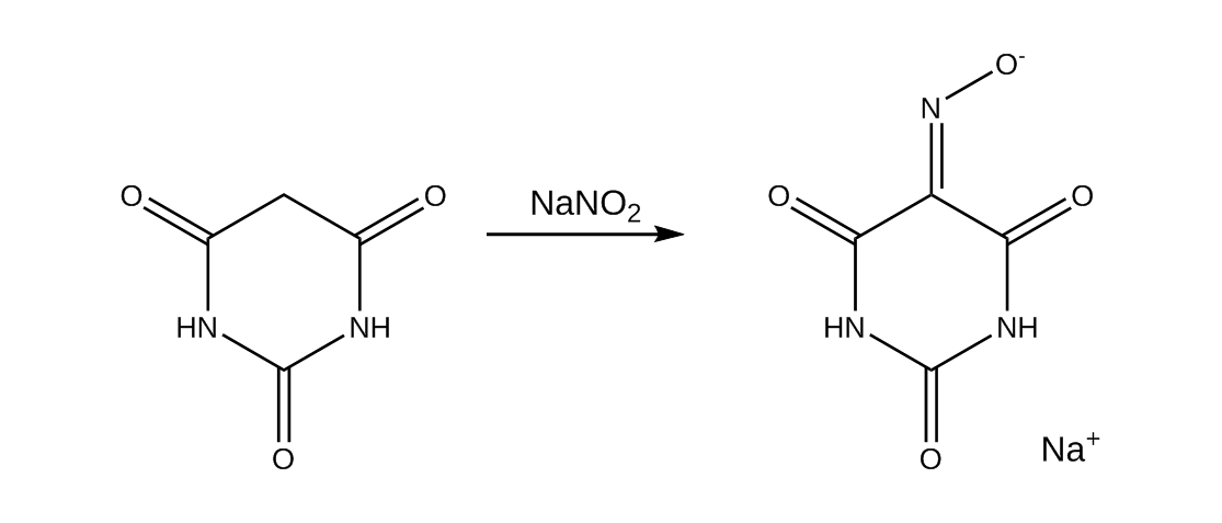 6.4 grams of barbituric acid (0.05 mol) were added to 100 ml of warm distilled water and stirred until full dissolution. A solution of 3.8 grams of sodium nitrite in 10 ml of water was added to it with stirring, causing the solution to undergo a change from yellow to deep permanganatesque purple. On cooling, a large amount of pink sodium violurate dihydrate precipitated out and solutions of 10 grams of sodium chloride and the aforementioned HOAc/NaOAc buffer were added to it. This serves to drive the reaction to completion and to maximize the yield, and the reaction was stirred for 2 more hours at room temp. This solution was then basified with 2.5 g of NaOH and set aside in the fridge for the final precipitation. The product was then vacuum filtered off and dried in a desiccator for a few days. We then forgot to measure the yield of sodium violurate dihydrate.