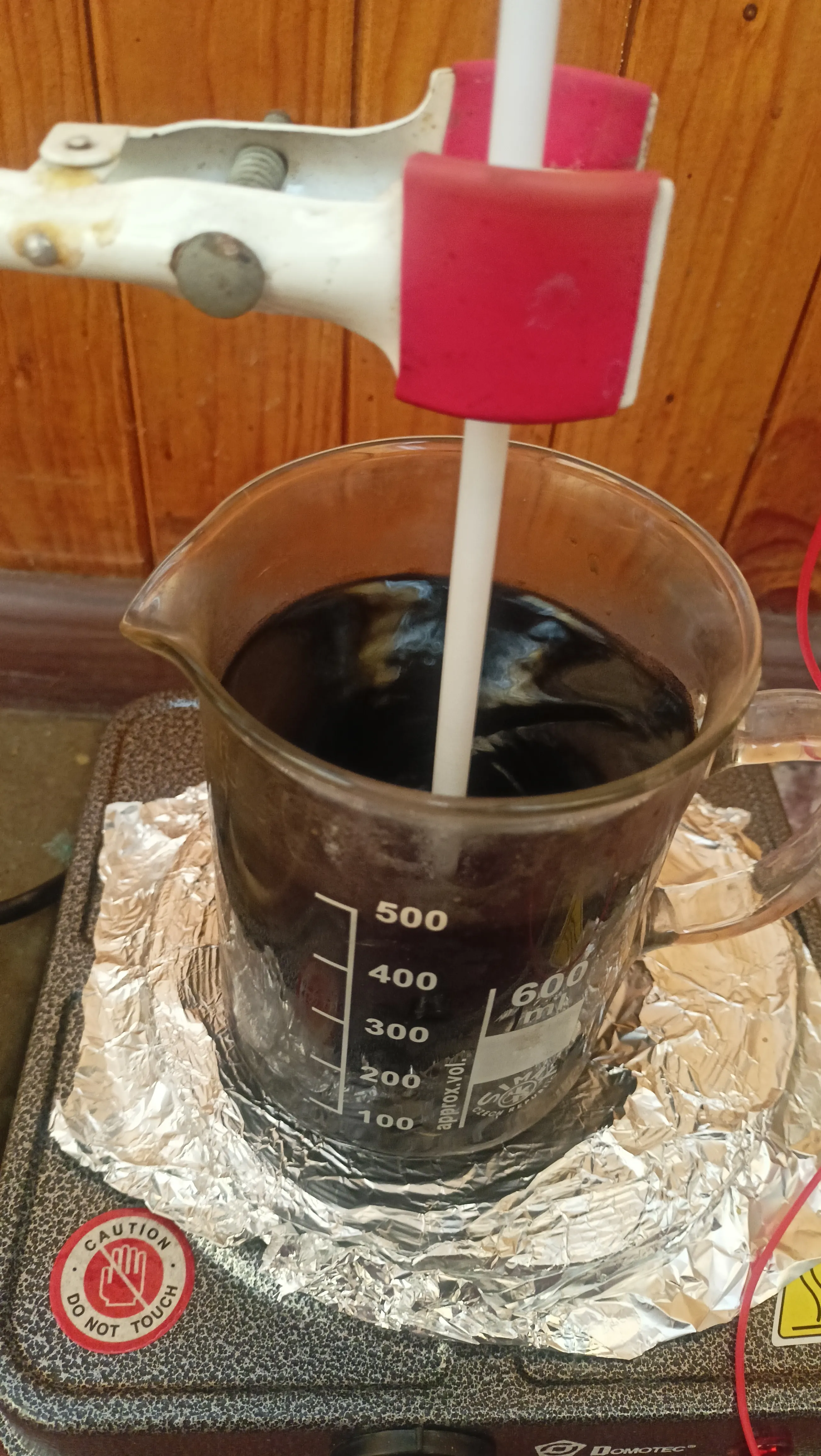The equipment used consists of a 10$ kitchen hotplate, a restored Soviet magnetic stirrer and an overhead stirrer that skinwalks the corpse of a failed attempt at a drilling implement. The latter consists of a cheap brushed motor, a drill chuck and a teflon stirrer rod3 that is kept from wriggling out of place with a small part that we cut out of plywood back in middle school. It does its job. During the synthesis the small plywood holder fell out of the clamp and fell right into the reaction mix, which is something that ideally should not happen.
