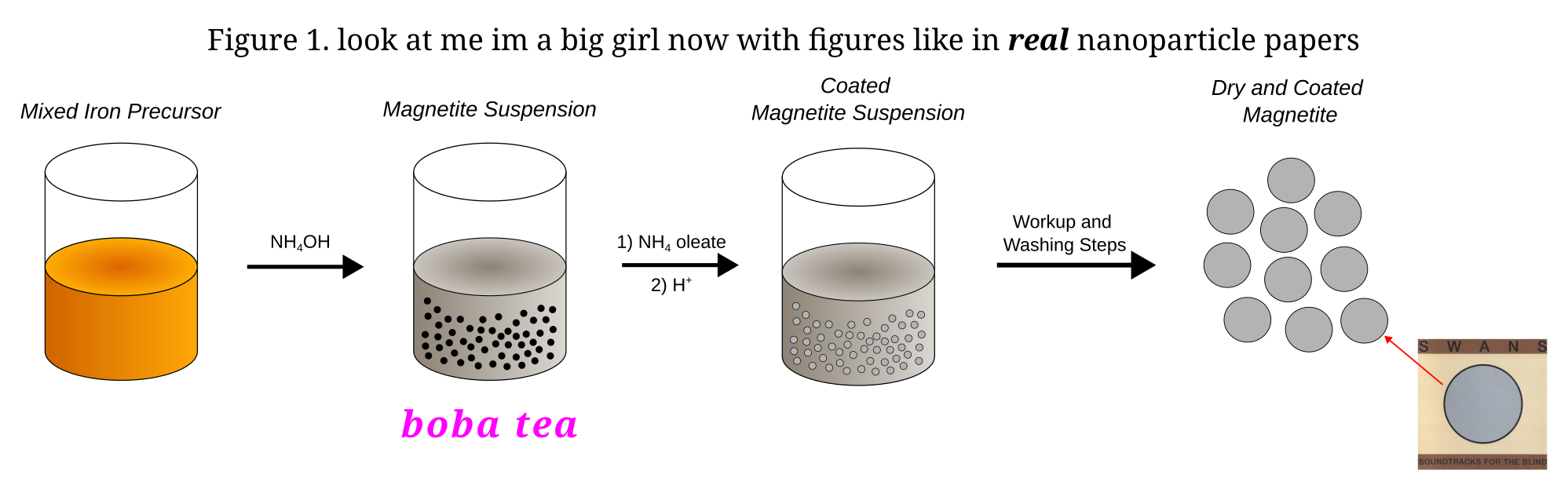 We honestly cannot 100% confirm that what we have here is a true bona fide ferrofluid. 90% chance that it really is ferrofluid or that the issue here lies in the suspension step and its just too concentrated. The general properties and vibes are… a smidgeon off? Really mostly the thickness of it. A few steps in the synthesis are “questionable” and though we really did promise to ourselves that we’ll redo it as soon as possible, that desire was swiftly dampened by the 3 day long cleanup process. Lo and behold we are approaching the 1 year anniversary of that synthesis and we are as aware of the day when we finally have to go as ever. The property of timescales to stretch this far so quickly brings us zero joy.